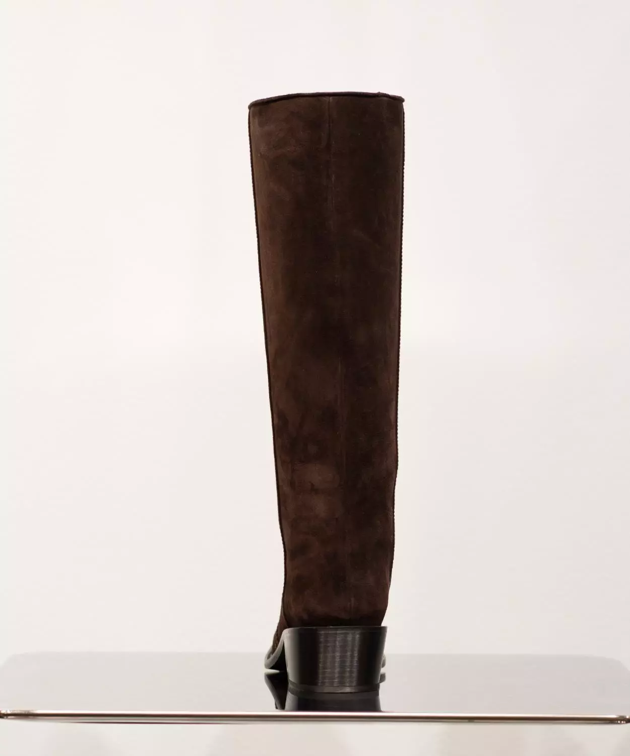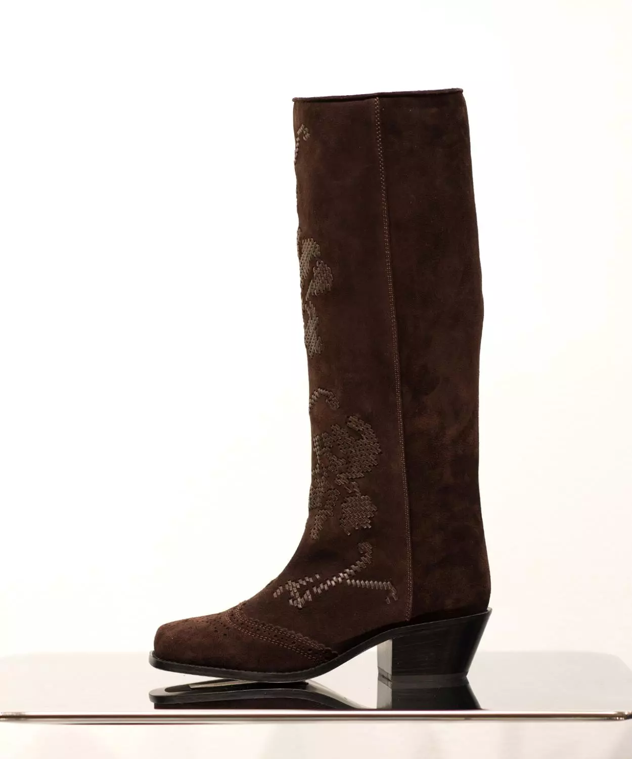 Mørk brune støvletter med 5cm høy hel. Broderier oppover skaftet er i glatt skinn.