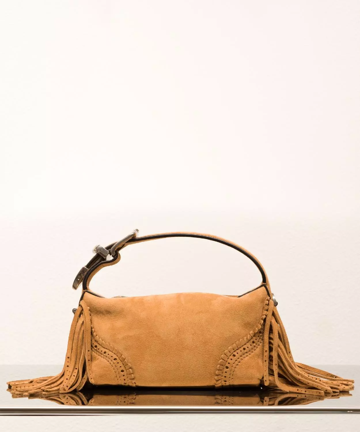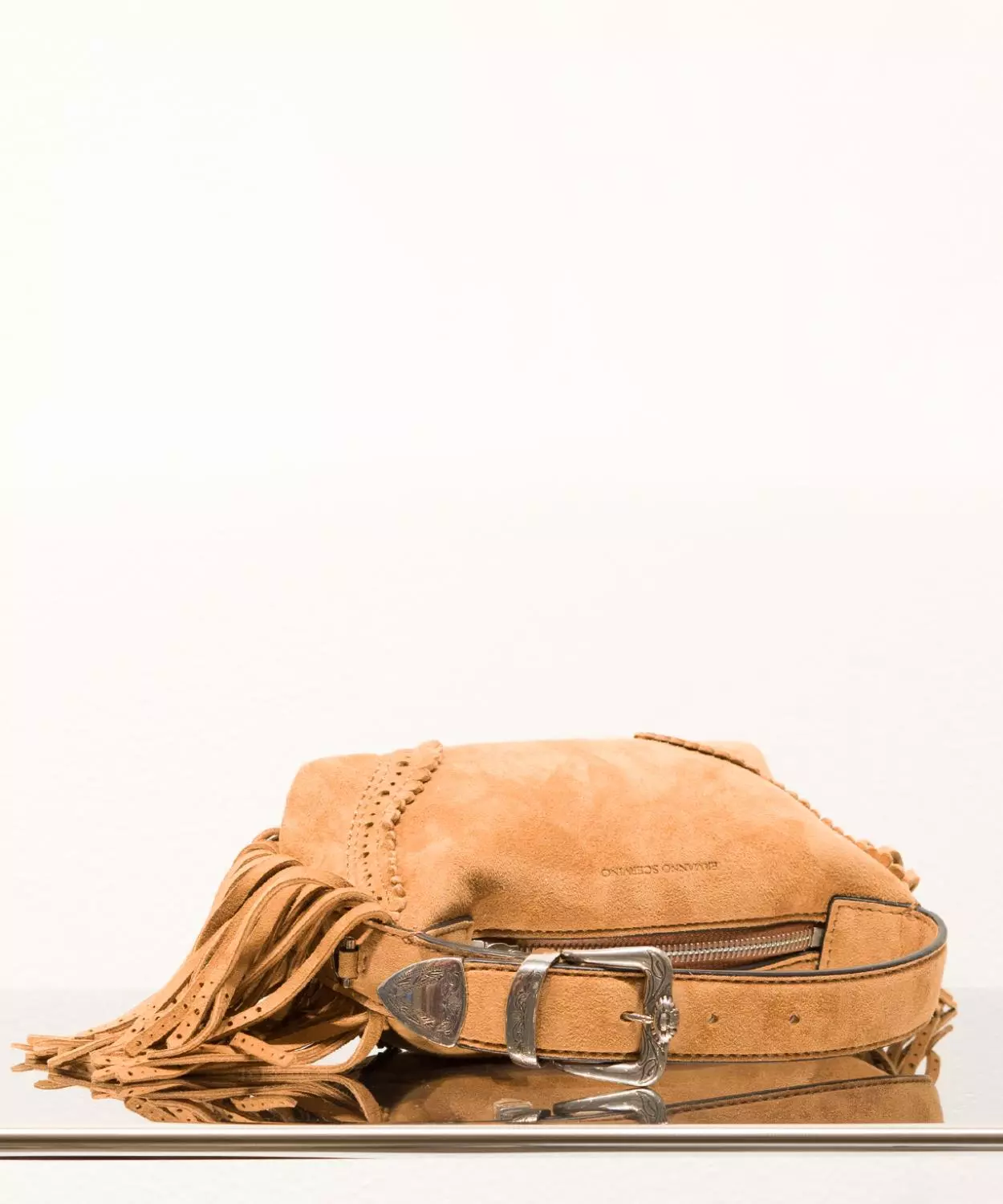 Liten veske fra Ermanno Scervino i semsket skinn. Vesken er cowboy inspirert med frynser, belte lignende hank og glidelås for å lukke og åpne.